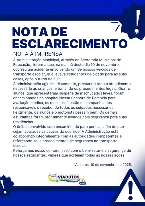 A Administração destacou que está colaborando com as autoridades competentes e reforçando os procedimentos de segurança no transporte escolar, reafirmando o compromisso com o bem-estar e a segurança dos alunos.