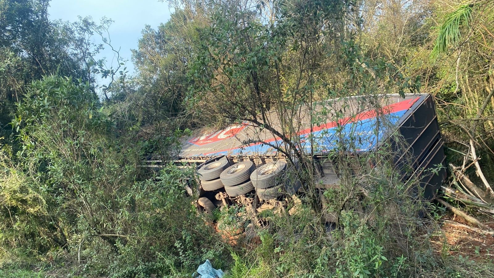 O condutor de uma carreta que seguia no sentido Estação/Getulio Vargas, por motivos ignorados perdeu o controle da direção, saiu da pista e tombou o veículo, as margens da rodovia.