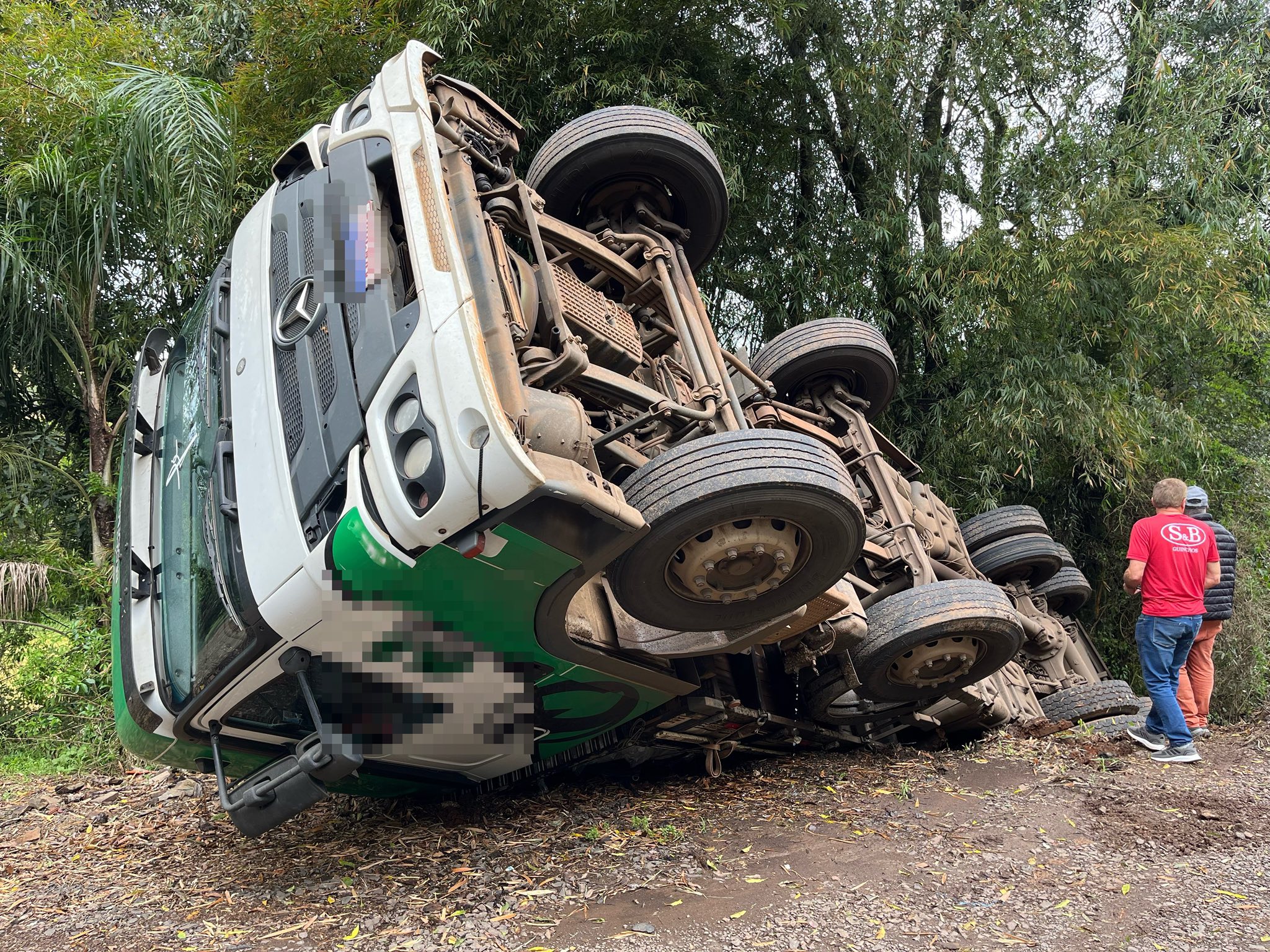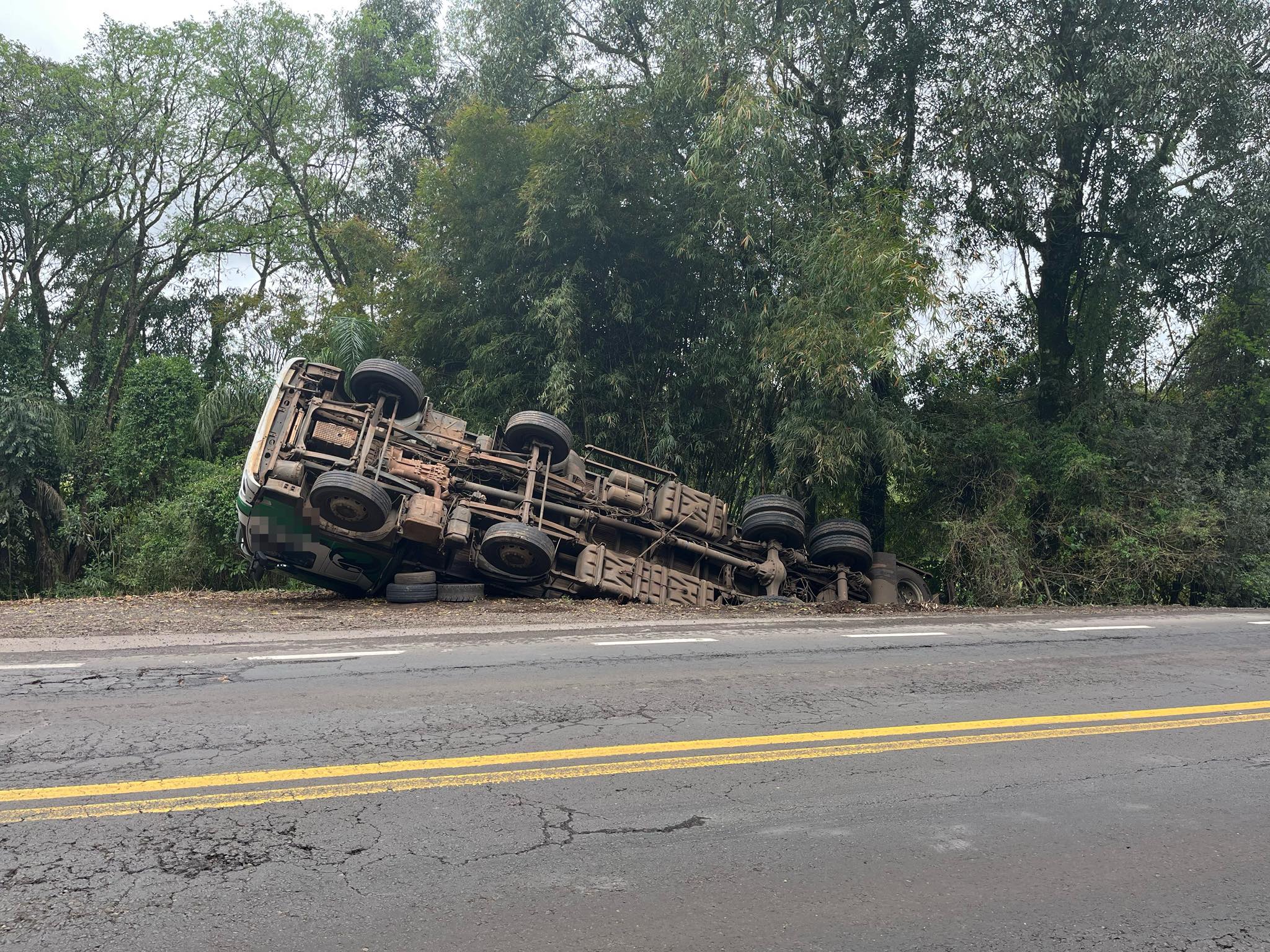 Conforme informações, o caminhão envolvido no incidente estava estacionado no acostamento quando o motorista percebe qua a carga estava pendendo para o lado, e acabou tombando no barranco. Felizmente ninguém ficou ferido.