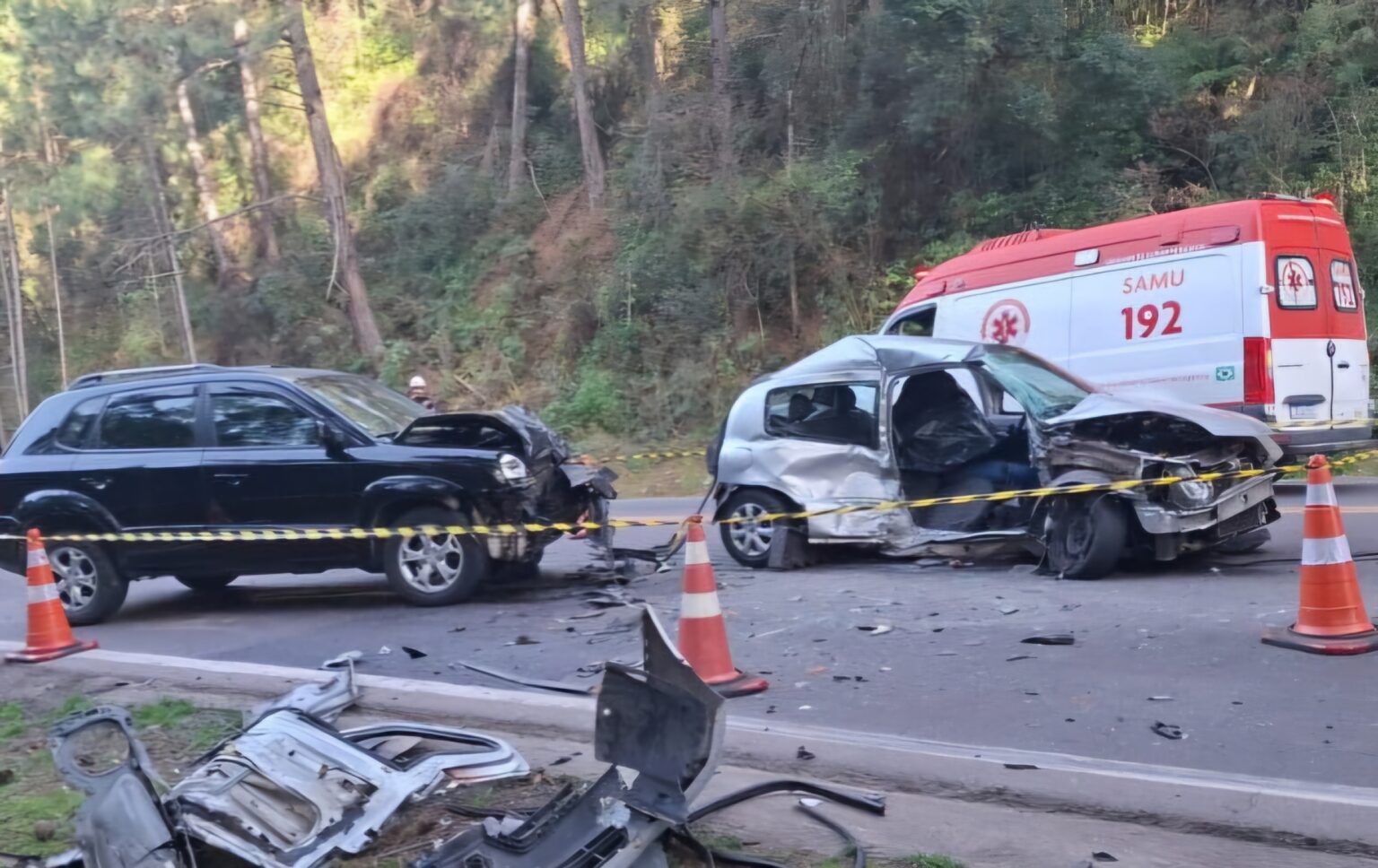 O motorista do Clio morreu no local. Um jovem que estava no mesmo veículo foi encaminhado ao hospital. O condutor do Celta também ficou ferido e precisou de atendimento médico após o carro bater em um barranco. O ocupante da Tucson não se feriu.