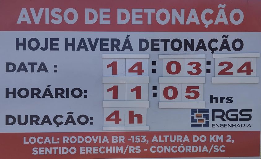 Comunicamos que o segmento da Rodovia BR-153, no Km 2,00, no sentido de Concórdia/SC a Erechim/RS, estará interditado em ambas as direções nesta quinta-feira, 14, a partir das 11h, devido à realização de obras emergenciais e detonação de rochas com o uso de explosivos. A previsão é que o tráfego seja liberado às 15h. Essa intervenção é parte do projeto de estabilização da via sob responsabilidade do Departamento Nacional de Infraestrutura de Transportes (DNIT).