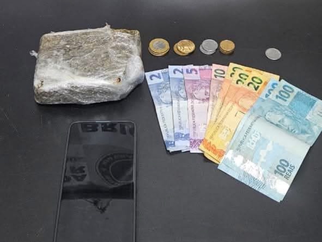 Foram apreendidos 01 telefone celular, 01 invólucro contendo aproximadamente 400g de maconha e R$ 285,00 (duzentos e oitenta e cinco reais) em espécie.