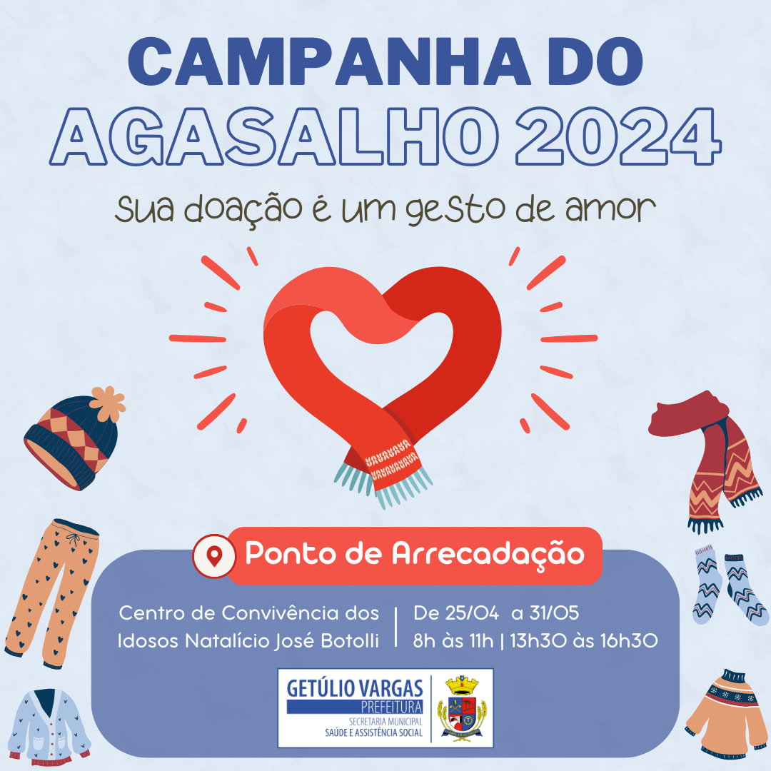 A época mais fria do ano se aproxima e com ela a oportunidade de demonstrarmos solidariedade e empatia com aqueles que mais precisam. É com esse espírito que a Administração Municipal de Getúlio Vargas, por meio da Secretaria Municipal de Saúde e Assistência Social, dá início à tão aguardada Campanha do Agasalho 2024, marcando um período de união e generosidade em prol daqueles que enfrentam o inverno com menos