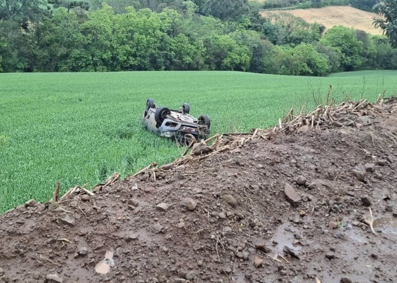 O condutor do veículo perdeu controle da direção, saiu da pista e capotou em uma lavoura.