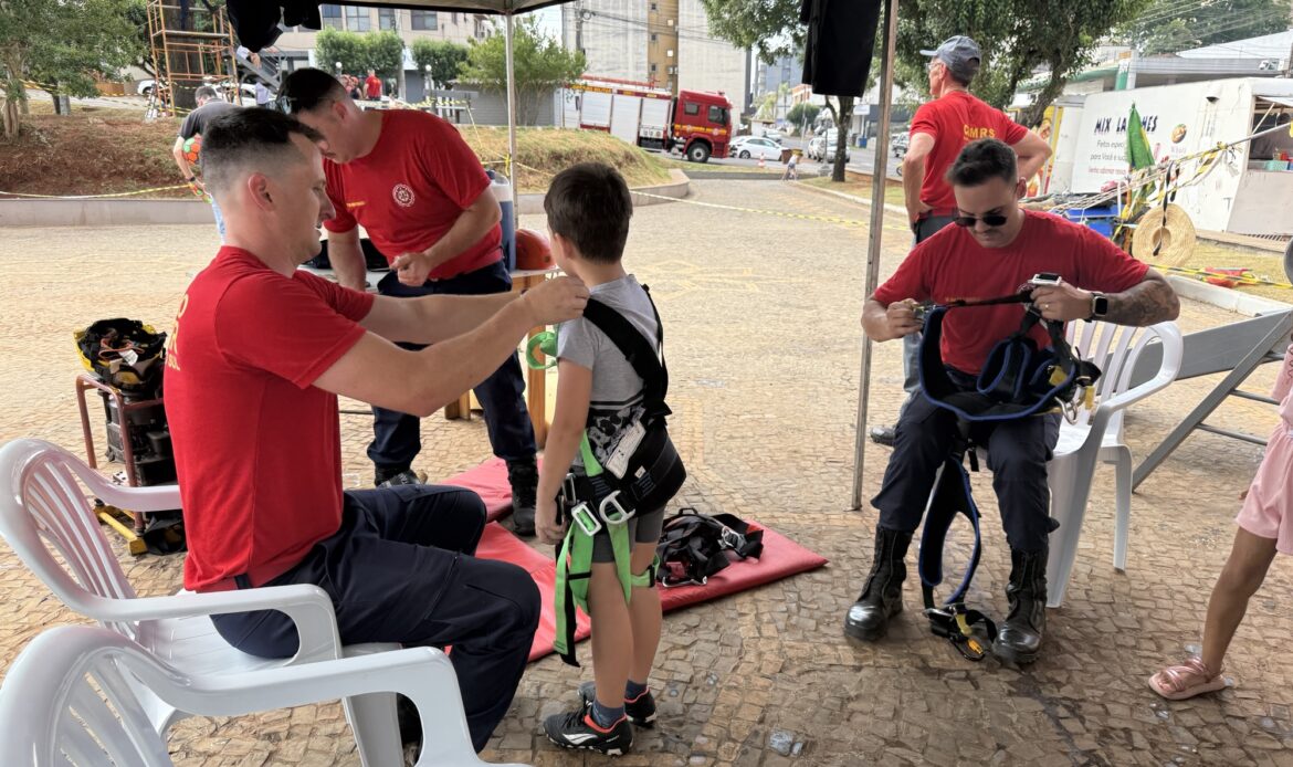 Enquanto isso, a praça viveu uma tarde de intensa participação comunitária. O espaço do Corpo de Bombeiros virou ponto de aventura: a 🧗 tirolesa garantiu diversão, sorrisos e fotos inesquecíveis. Bombeiros ajustavam os equipamentos e orientavam cada criança, reforçando a importância da segurança e da prevenção.