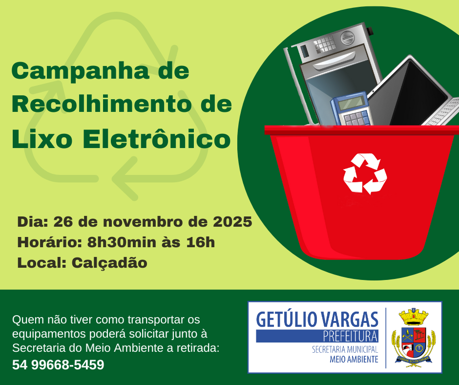 A Prefeitura de Getúlio Vargas, por meio da Secretaria Municipal do Meio Ambiente, realizará no dia 26 de novembro de 2025 mais uma edição da Campanha de Recolhimento de Lixo Eletrônico, ação voltada ao descarte ambientalmente adequado de equipamentos eletroeletrônicos fora de uso. A iniciativa acontece no Calçadão, das 8h30 às 16h, com atendimento direto à população.