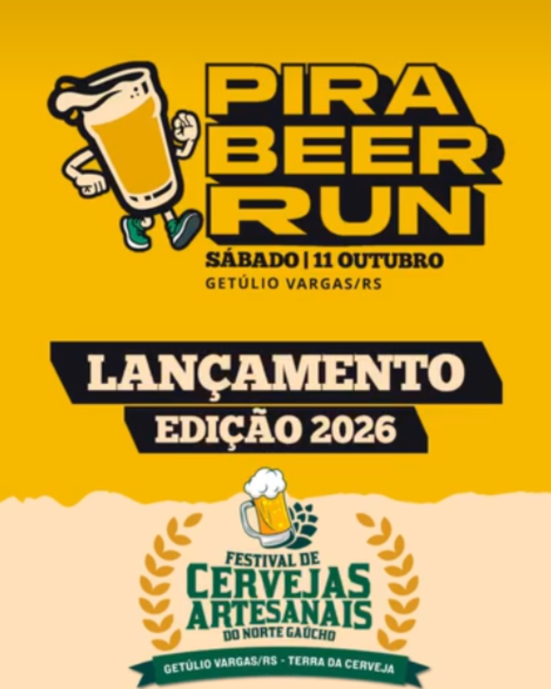 No dia 11 de outubro, Getúlio Vargas sediará o Pira Beer Run, corrida temática que une esporte e descontração em torno da cultura cervejeira. O evento integra o lançamento da edição 2026 do Festival de Cervejas Artesanais do Norte Gaúcho, consolidando o município como referência na valorização e celebração das cervejarias da região, e acontece a partir das 14h na Pista Atlética do Centro Municipal de Esportes de Getúlio Vargas.