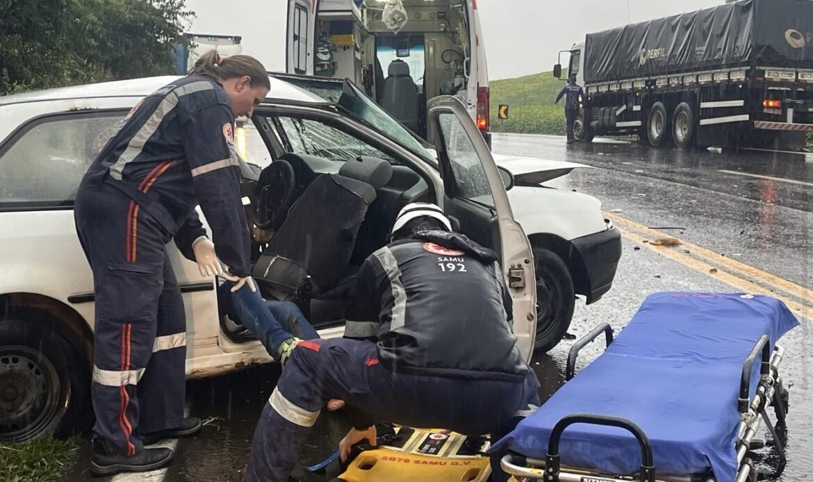 A colisão envolveu um VW/Gol e um Caminhão. O Condutor do veículo de passeio ficou ferido e foi atendido pelo SAMU de Getúlio Vargas e encaminhado para o Hospital São Roque.