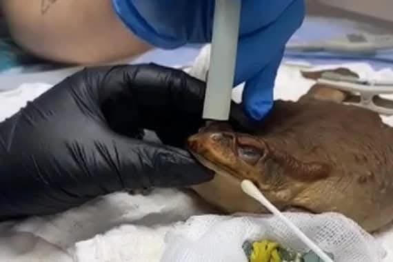 Agora, o sapo-cururu — que é fêmea — se recupera da cirurgia e já se alimenta sozinho.