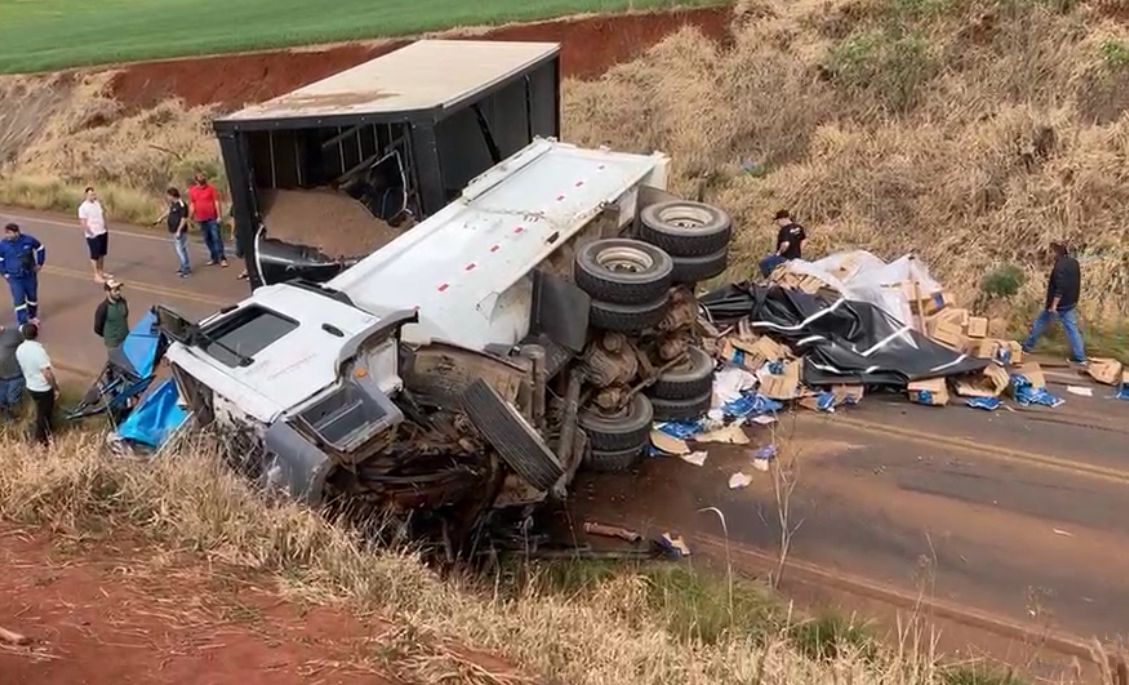 A pista está totalmente interditada. O motorista do caminhão caçamba não teve ferimentos graves.
