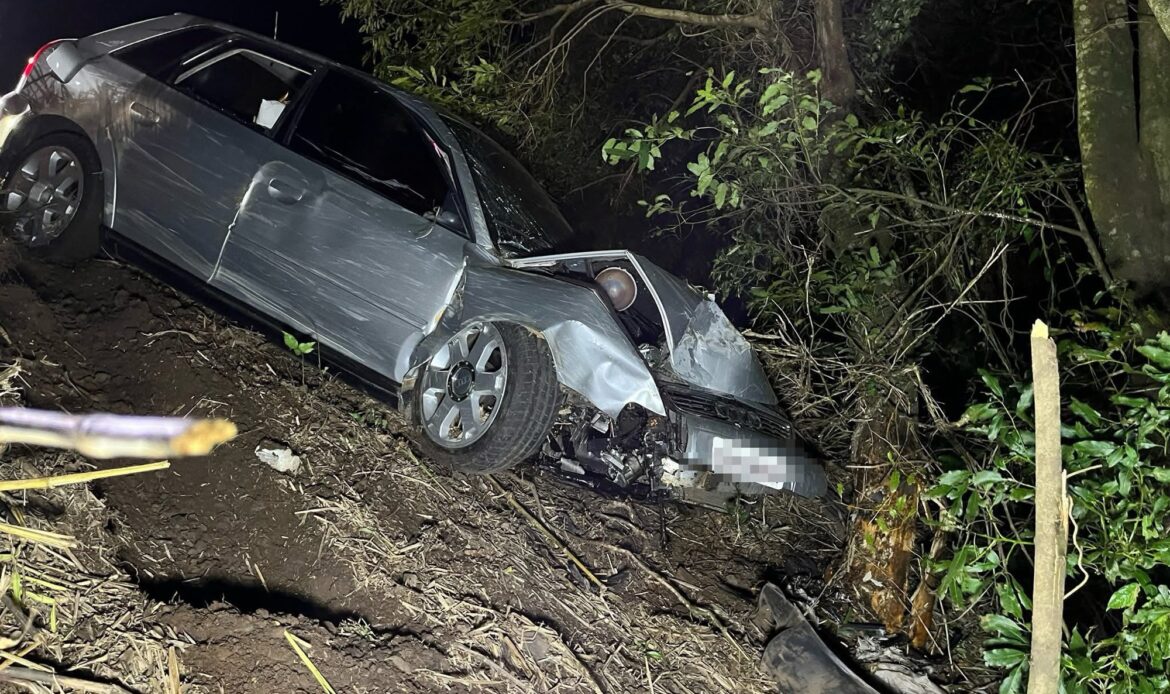 Por motivos desconhecidos, o condutor de um Audi/A3, cinza, com placas de Erechim, perdeu o controle da direção, saiu da pista e bateu em algumas árvores.