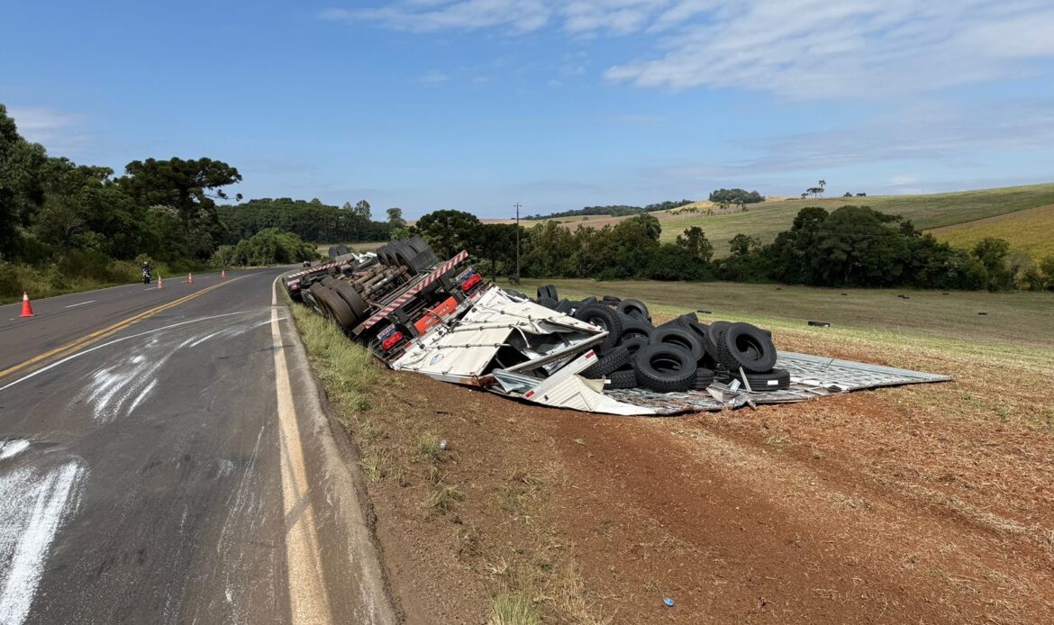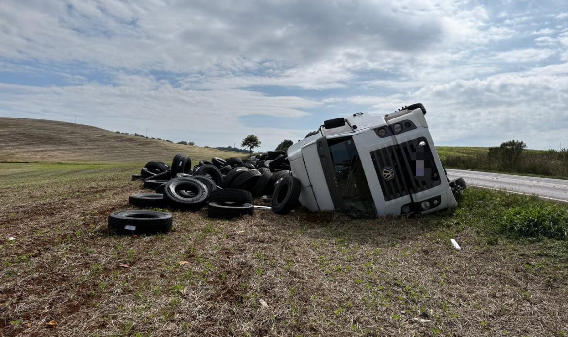O acidente envolveu uma carreta que estava carregada com pneus, que seguia no sentido Sertão.