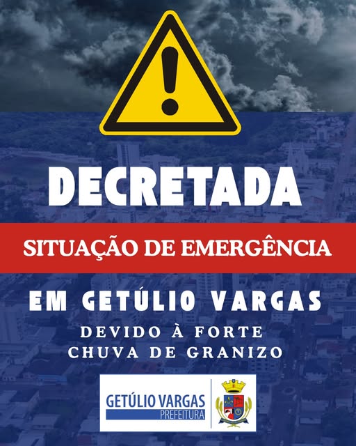 O Município de Getúlio Vargas decretou, nesta segunda-feira (24), Situação de Emergência em razão dos estragos causados pela intensa tempestade de granizo que atingiu a cidade e o interior no domingo, 23 de novembro, por volta das 16h. A medida foi oficializada por meio do Decreto nº 4.161/2025, assinado pelo vice-prefeito em exercício, Dinarte Afonso Tagliari Farias.